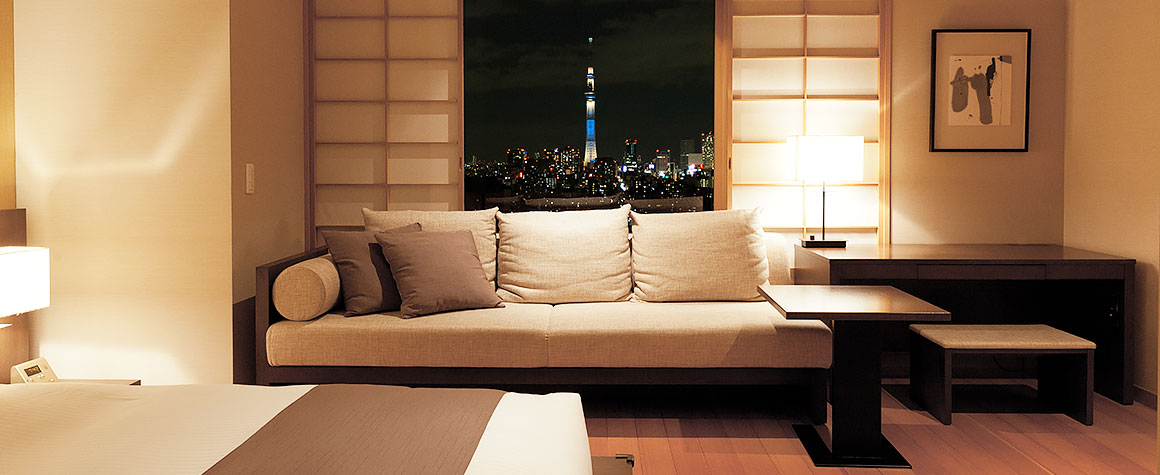 房间内就连室内家居都韵味着日本风格。眼下璀璨的夜景中,东京的新象征"东京晴空塔"从正面应入眼帘。 在门口玄关脱鞋进入室内,仿佛进入家门的舒适感。 在酒店唯一有大玻璃的浴室。 您日常的疲劳在树木的清香中放松得以缓解。