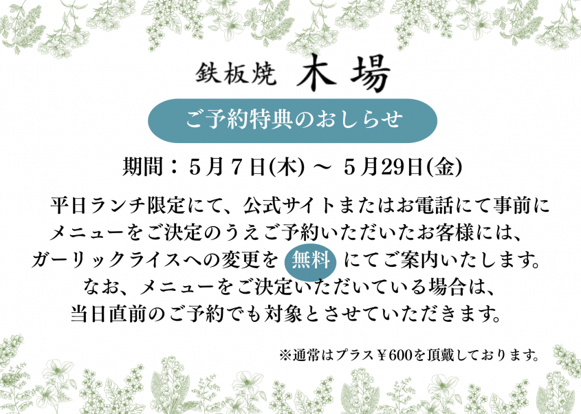 鉄板焼 木場 ご予約特典 (5/7~5/29)