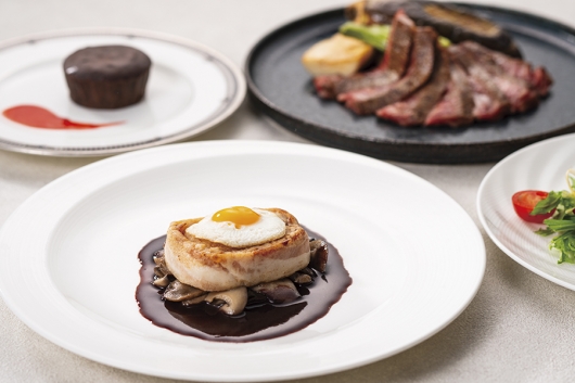 魚料理では鮟鱇のベーコン巻きに赤ワインソースを合わせました。 お肉は外国産フィレ120g または 国産牛リブロース 80g をお選びいただけます。 ホテル最上階の鉄板焼で、至福のひとときをお過ごしください。