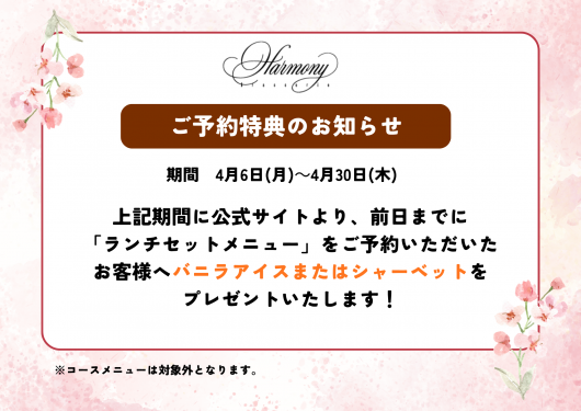| 備考 | ※公式サイトからの前日までのご予約に限ります。 ※コースメニューは対象外となります。 ※シャーベットは入荷状況により内容が変更になる可能性がございます。 |