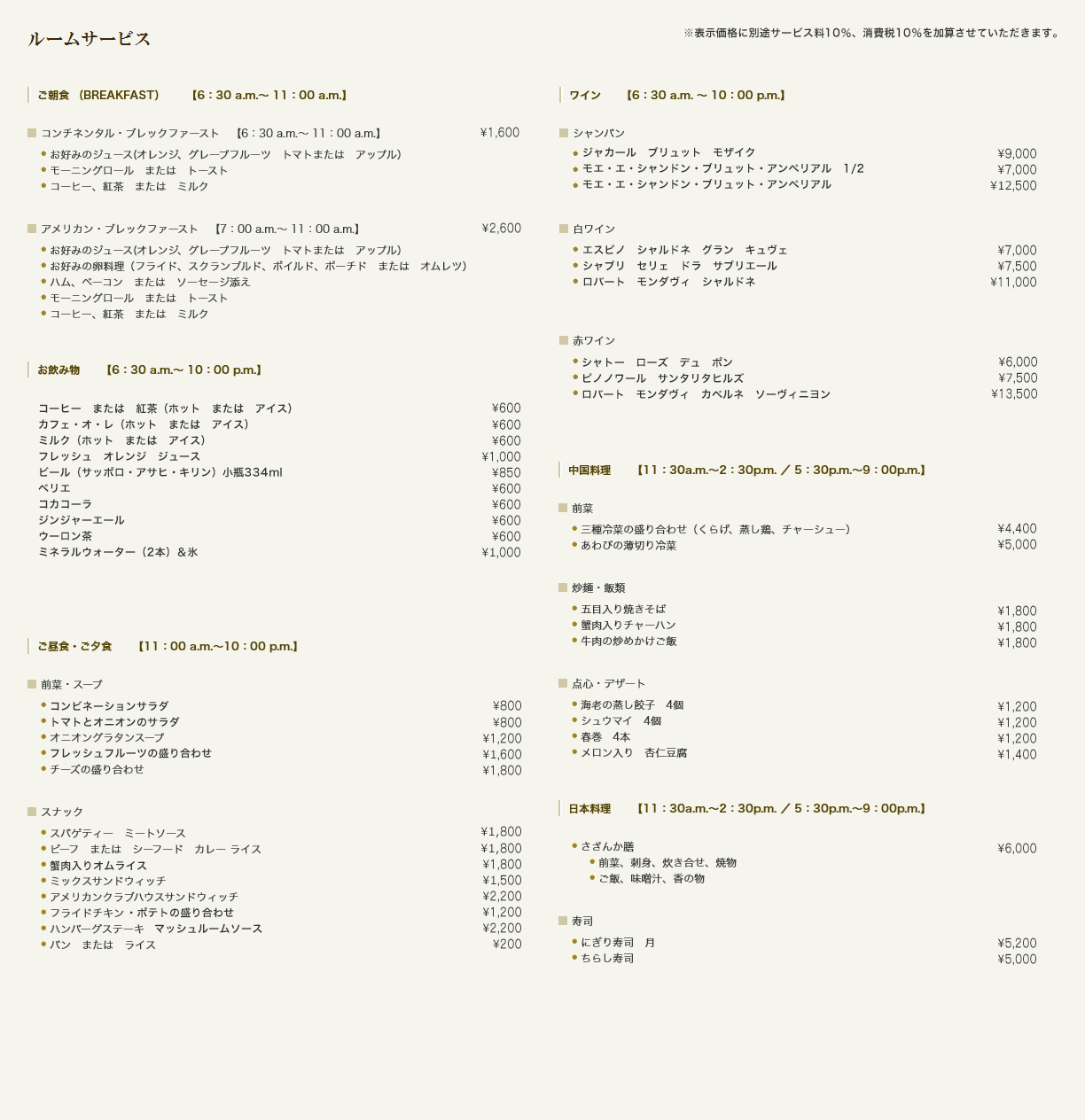 ご宿泊されているお部屋でゆっくりと、ホテルの味がお楽しみいただけます。 ワイン、シャンパンなどお飲み物も豊富に取り揃えております。 また、ご宿泊時のフルーツ、ケーキなどのご手配も承っております。