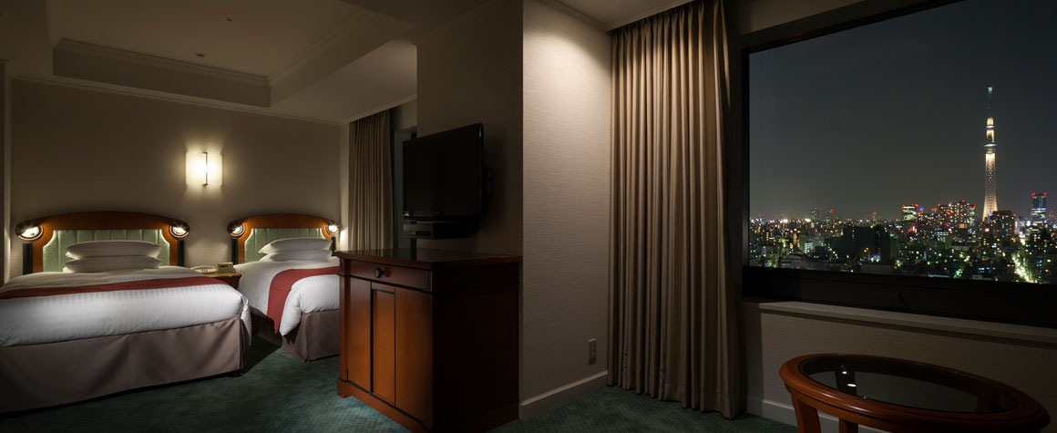 ご夫婦やカップルでのご利用からご家族皆様でのご利用まで、お客様のおくつろぎのかたちに合わせた381室をご用意しております。高層階北側のお部屋からは東京スカイツリービューがお楽しみいただけます。